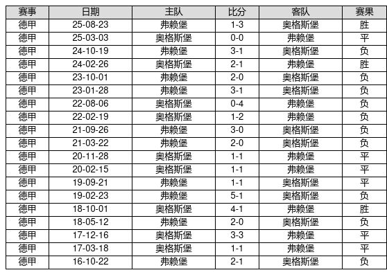 奥格斯堡 VS 弗赖堡两队近10年的交战次数为19场,奥格斯堡3胜6平10负,赢球概率为15.8%,平局概率为31.6%,输球概率为52.6%。