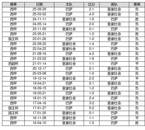 皇家社会 VS 巴萨两队近10年的交战次数为24场,皇家社会3胜3平18负,赢球概率为12.5%,平局概率为12.5%,输球概率为75.0%。
