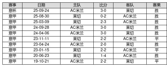 AC米兰 VS 莱切两队近10年的交战次数为10场,AC米兰7胜3平0负,赢球概率为70.0%,平局概率为30.0%,输球概率为0.0%。