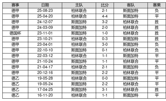 斯图加特 VS 柏林联合两队近10年的交战次数为16场,斯图加特5胜7平4负,赢球概率为31.2%,平局概率为43.8%,输球概率为25.0%。