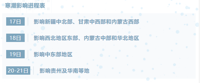 降水方面,17日至21日,中东部地区将自北向南出现大范围雨雪天气过程。西北地区东部、华北南部、黄淮、江汉、江淮西部、江南北部等地有中到大雪或雨夹雪,其中陕西南部、山西南部、河南、山东西部和半岛地区、湖北中西部、湖南北部、安徽等地部分地区有暴雪,主要降雪时段集中在19日至20日。上述地区新增积雪深度普遍为3—8厘米,局地可达10厘米以上,秦巴山区局地甚至超过15厘米。